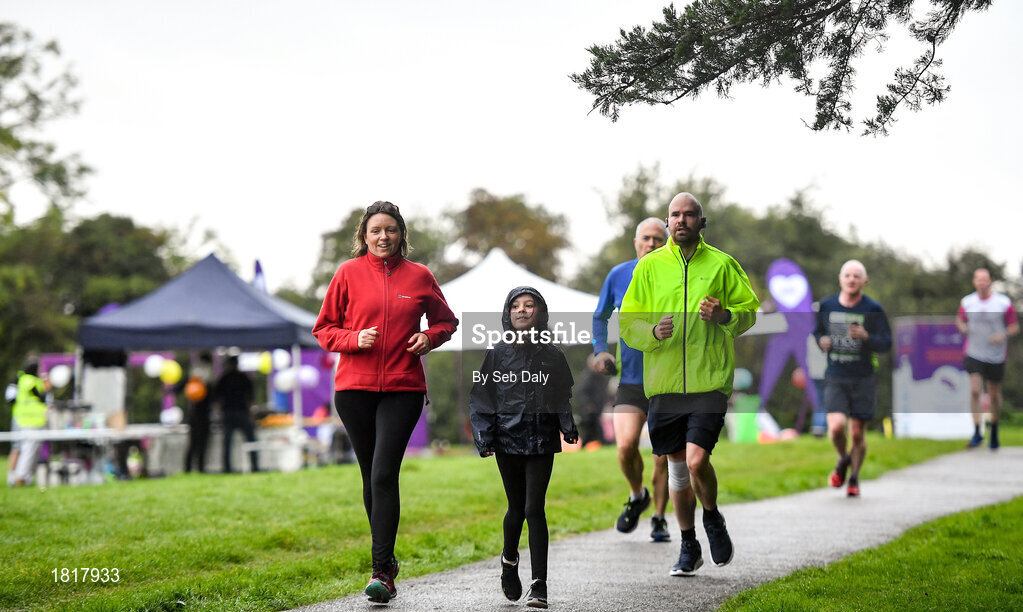 19 October 2019; Participants during the Porterstown parkrun where Vhi hosted a special event to celebrate their partnership with parkrun Ireland. Vhi ambassador and Olympian David Gillick was on hand to lead the warm up for parkrun participants before completing the 5km free event. Parkrunners enjoyed refreshments post event at the Vhi Rehydrate, Relax, Refuel and Reward areas. parkrun in partnership with Vhi support local communities in organising free, weekly, timed 5k runs every Saturday at 9.30am. To register for a parkrun near you visit www.parkrun.ie. Photo by Seb Daly/Sportsfile