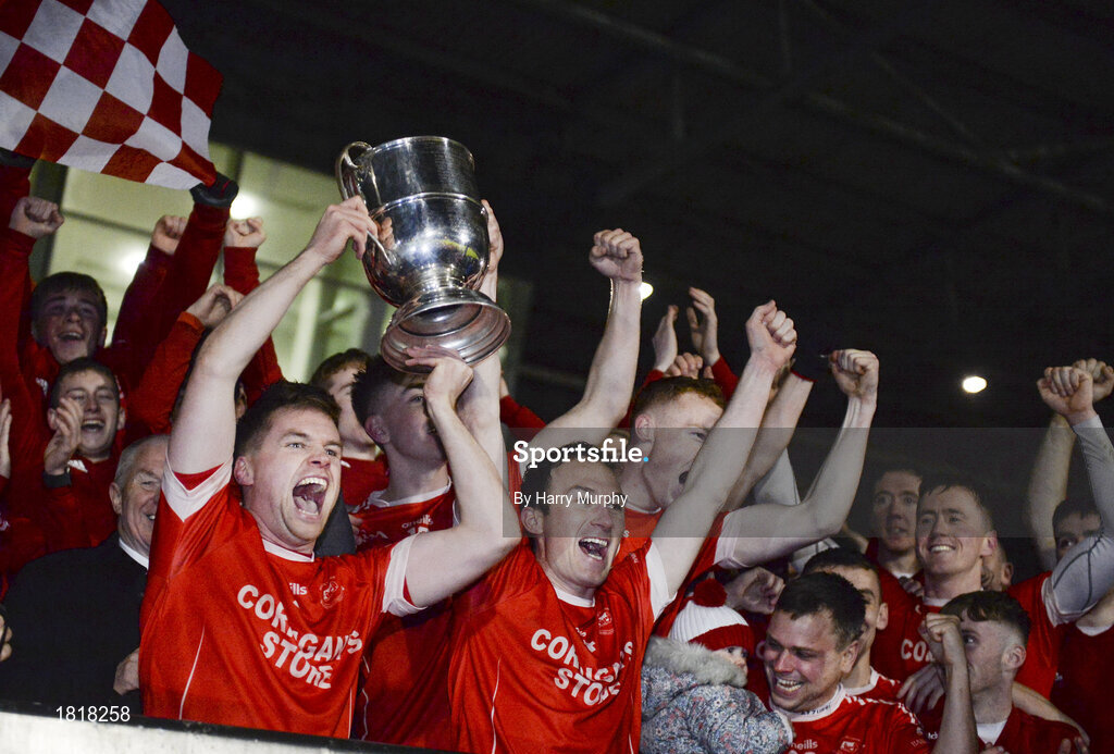 19 October 2019; Damien Coleman and Alan Dillon of Ballintubber lift the trophy following the Mayo County Senior Club Football Championship Final match between Ballaghaderreen and Ballintubber at Elvery's MacHale Park in Castlebar, Mayo. Photo by Harry Murphy/Sportsfile