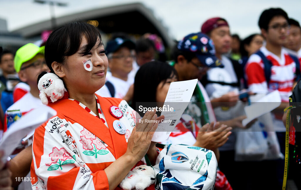20 October 2019; Japan supporters sing the South Africa National Anthem ahead of the 2019 Rugby World Cup Quarter-Final match between Japan and South Africa at the Tokyo Stadium in Chofu, Japan. Photo by Ramsey Cardy/Sportsfile