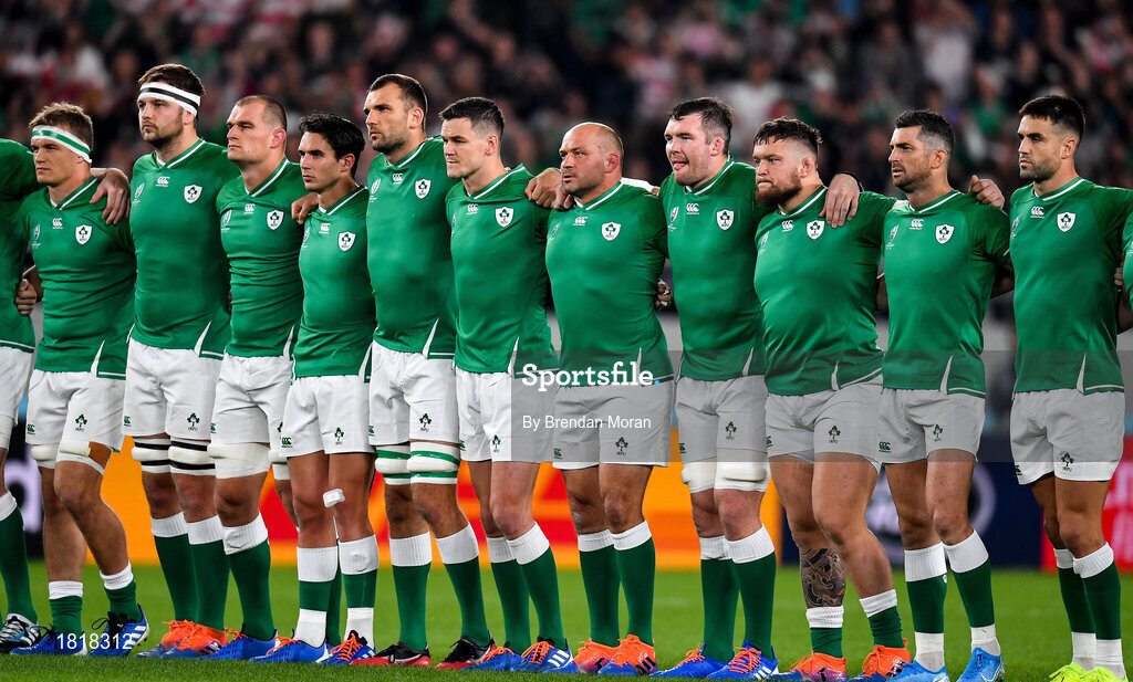 19 October 2019; Ireland players, from left, Josh van der Flier, Iain Henderson, Rhys Ruddock, Joey Carbery, Tadhg Beirne, Jonathan Sexton, Rory Best, Peter O'Mahony, Andrew Porter, Rob Kearney, and Conor Murray face the New Zealand team as they perform the Haka prior to the 2019 Rugby World Cup Quarter-Final match between New Zealand and Ireland at the Tokyo Stadium in Chofu, Japan. Photo by Brendan Moran/Sportsfile