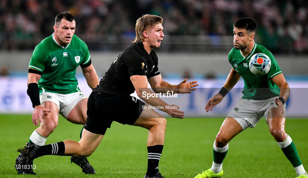 19 October 2019; Jack Goodhue of New Zealand in action against Cian Healy and Conor Murray of Ireland during the 2019 Rugby World Cup Quarter-Final match between New Zealand and Ireland at the Tokyo Stadium in Chofu, Japan. Photo by Brendan Moran/Sportsfile