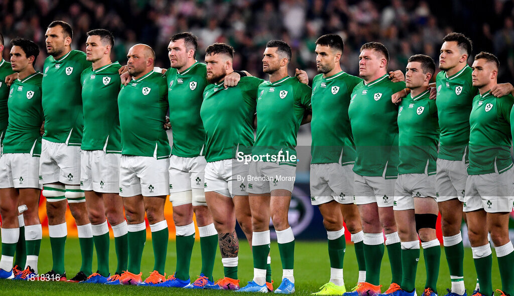 19 October 2019; Ireland players, from left, Joey Carbery, Tadhg Beirne, Jonathan Sexton, Rory Best, Peter O'Mahony, Andrew Porter, Rob Kearney, Conor Murray, Tadhg Furlong, Luke McGrath, Jacob Stockdale, and Jordan Larmour face the New Zealand team as they perform the Haka prior to the 2019 Rugby World Cup Quarter-Final match between New Zealand and Ireland at the Tokyo Stadium in Chofu, Japan. Photo by Brendan Moran/Sportsfile