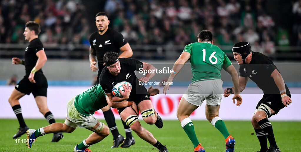 19 October 2019; Scott Barrett of New Zealand is tackled by Josh Van der Flier of Ireland during the 2019 Rugby World Cup Quarter-Final match between New Zealand and Ireland at the Tokyo Stadium in Chofu, Japan. Photo by Brendan Moran/Sportsfile