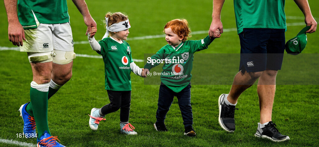 19 October 2019; Indie O'Mahony, left, daughter of Peter O'Mahony of Ireland, and Felix Ryan, son of John Ryan of Ireland, hold hands with each other and their fathers as they walk the pitch after the 2019 Rugby World Cup Quarter-Final match between New Zealand and Ireland at the Tokyo Stadium in Chofu, Japan. Photo by Brendan Moran/Sportsfile
