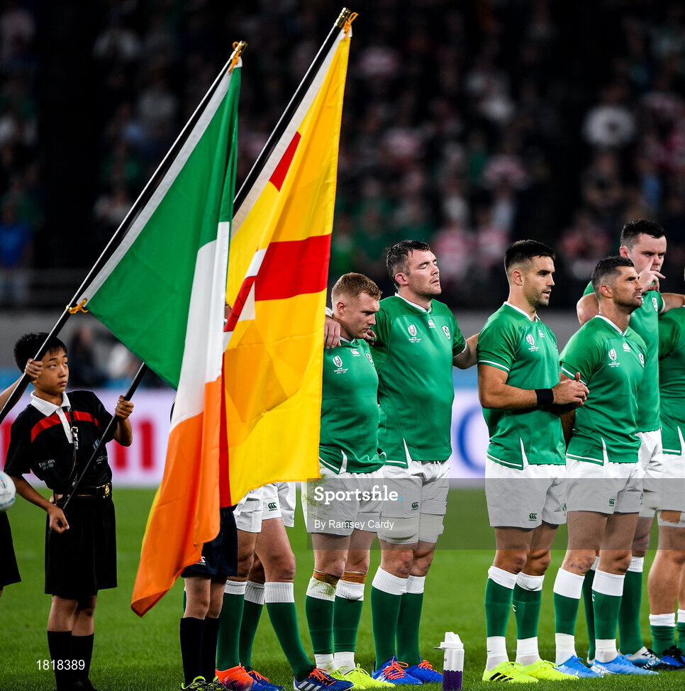 19 October 2019; Ireland players, from left, Keith Earls, Peter O'Mahony, Conor Murray, Rob Kearney and James Ryan line up for the National Anthem ahead of the 2019 Rugby World Cup Quarter-Final match between New Zealand and Ireland at the Tokyo Stadium in Chofu, Japan. Photo by Ramsey Cardy/Sportsfile