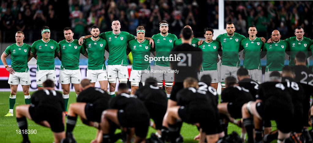 19 October 2019; Ireland players, from left, Keith Earls, CJ Stande, Niall Scannell, Robbie Henshaw, James Ryan, Josh van der Flier, Iain Henderson, Joey Carbery, Tadhg Beirne, Jonathan Sexton, Rory Best and Peter O'Mahony watch New Zealand perform the Haka ahead of the 2019 Rugby World Cup Quarter-Final match between New Zealand and Ireland at the Tokyo Stadium in Chofu, Japan. Photo by Ramsey Cardy/Sportsfile