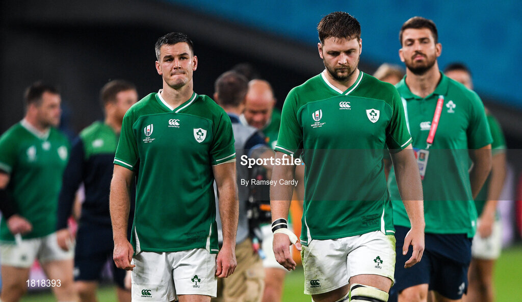 19 October 2019; Jonathan Sexton, left, and Iain Henderson of Ireland following the 2019 Rugby World Cup Quarter-Final match between New Zealand and Ireland at the Tokyo Stadium in Chofu, Japan. Photo by Ramsey Cardy/Sportsfile