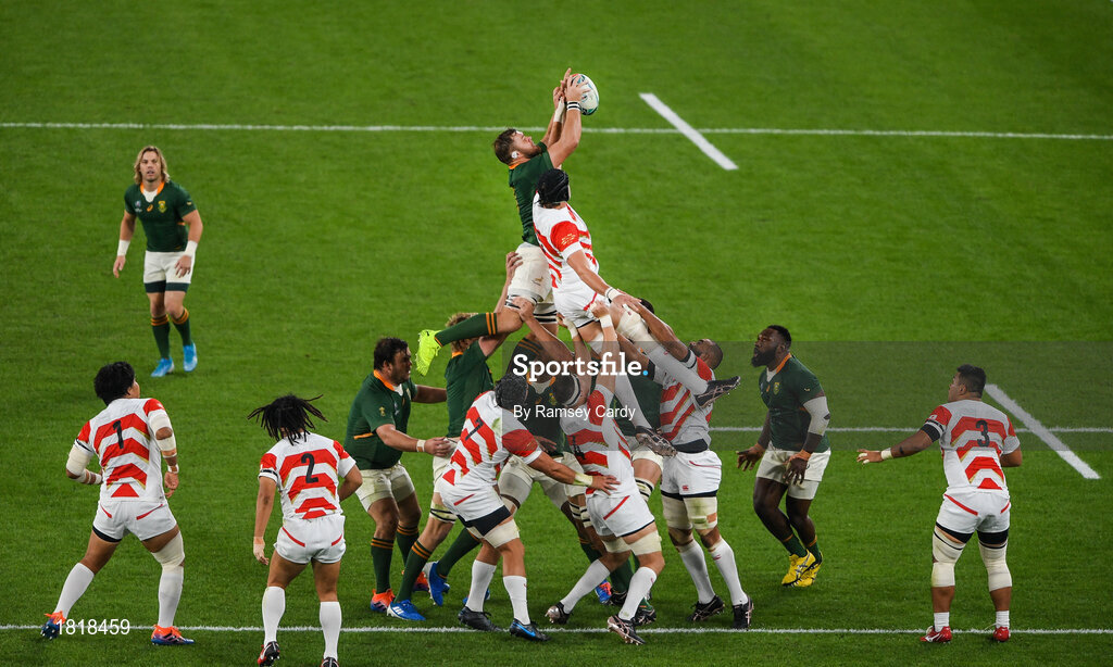 20 October 2019; Duane Vermeulen of South Africa wins possession in the lineout from James Moore of Japan during the 2019 Rugby World Cup Quarter-Final match between Japan and South Africa at the Tokyo Stadium in Chofu, Japan. Photo by Ramsey Cardy/Sportsfile