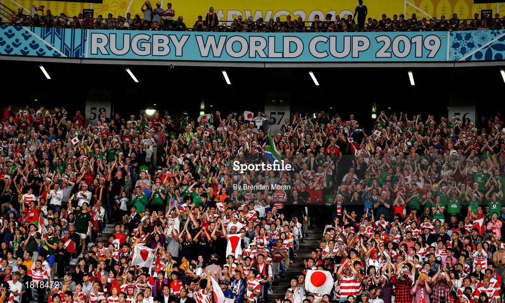 20 October 2019; Irish fans sing along with South African fans and Japanese fans during the 2019 Rugby World Cup Quarter-Final match between Japan and South Africa at the Tokyo Stadium in Chofu, Japan. Photo by Brendan Moran/Sportsfile