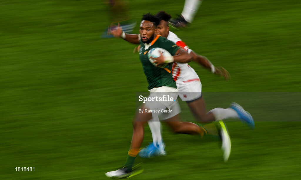 20 October 2019; Lukhanyo Am of South Africa is tackled by Kotaro Matsushima of Japan during the 2019 Rugby World Cup Quarter-Final match between Japan and South Africa at the Tokyo Stadium in Chofu, Japan. Photo by Ramsey Cardy/Sportsfile