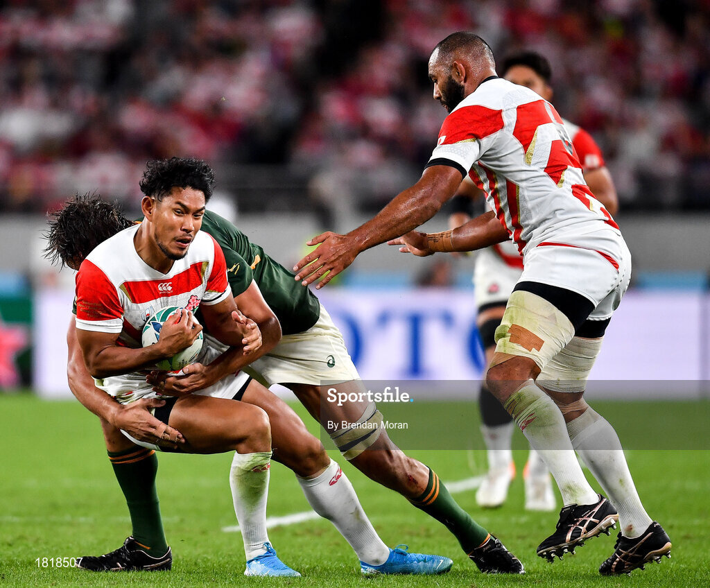 20 October 2019; Ryohei Yamanaka of Japan is tackled by Eben Etzebeth of South Africa during the 2019 Rugby World Cup Quarter-Final match between Japan and South Africa at the Tokyo Stadium in Chofu, Japan. Photo by Brendan Moran/Sportsfile