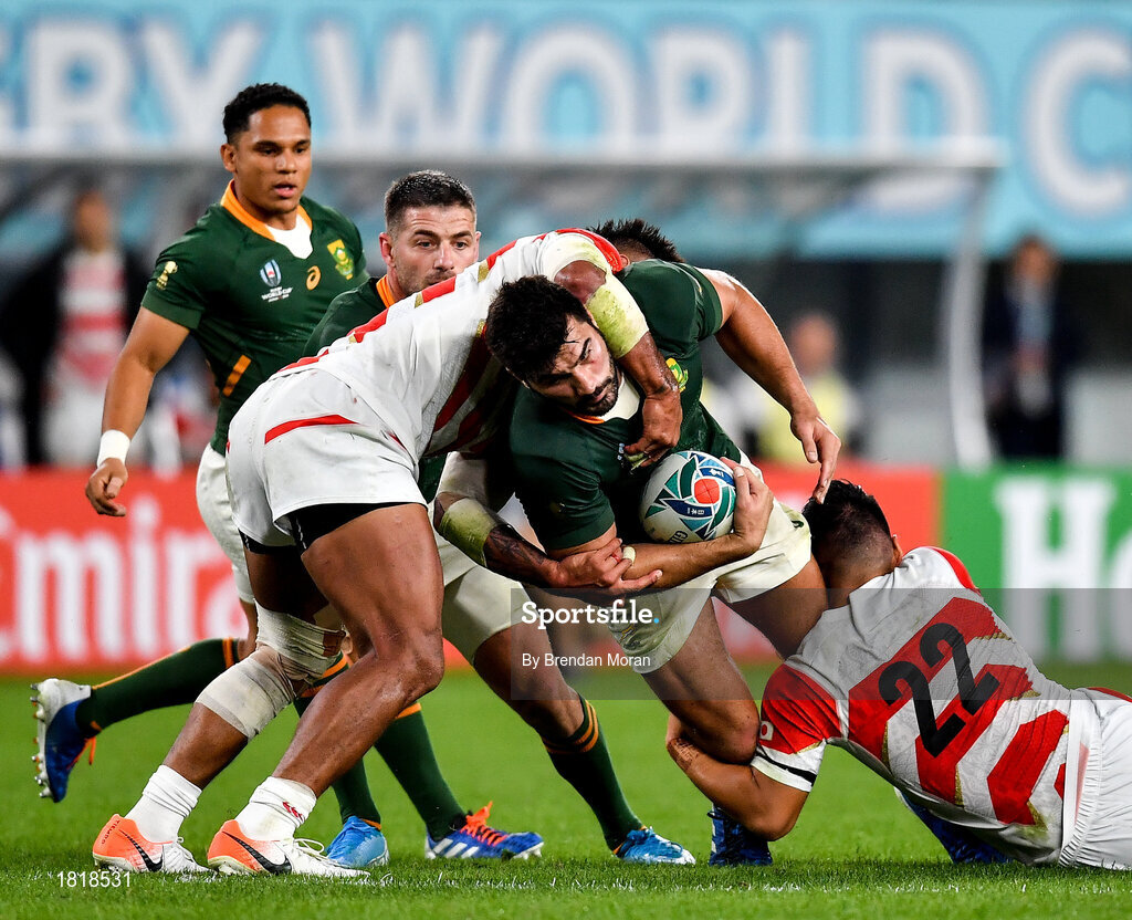 20 October 2019; Damian de Allende of South Africa is tackled by Amanaki Lelei Mafi, left, and Rikiya Matsuda of Japan during the 2019 Rugby World Cup Quarter-Final match between Japan and South Africa at the Tokyo Stadium in Chofu, Japan. Photo by Brendan Moran/Sportsfile