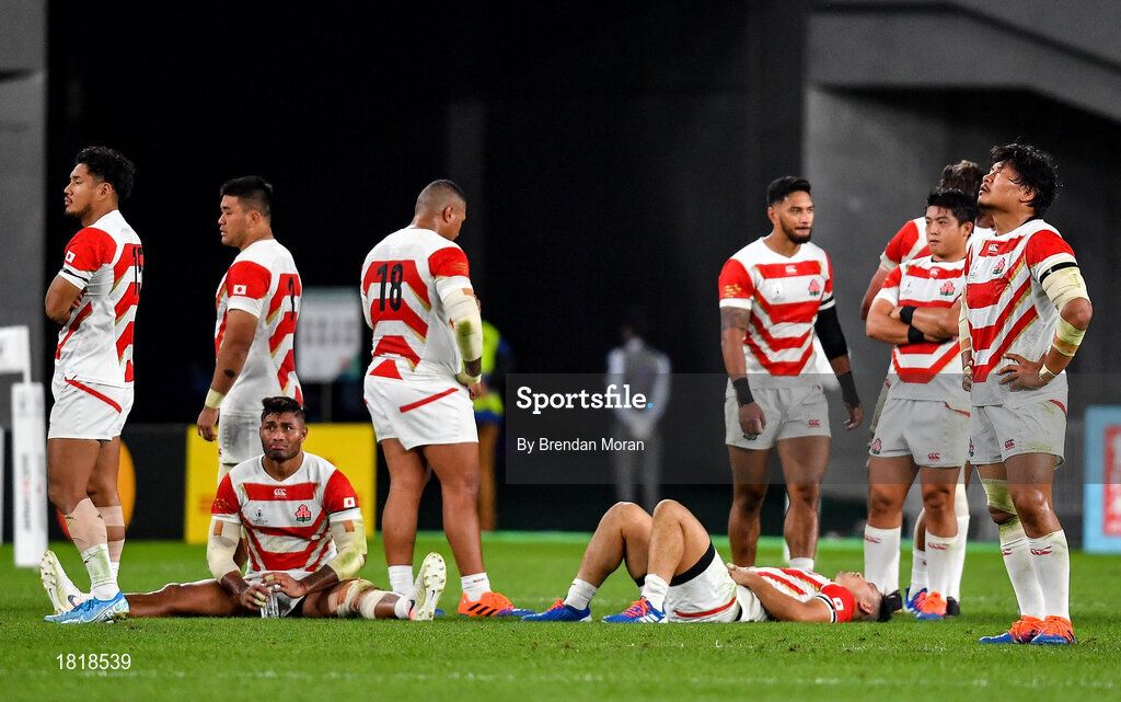 20 October 2019; Dejected Japanese players following the 2019 Rugby World Cup Quarter-Final match between Japan and South Africa at the Tokyo Stadium in Chofu, Japan. Photo by Brendan Moran/Sportsfile