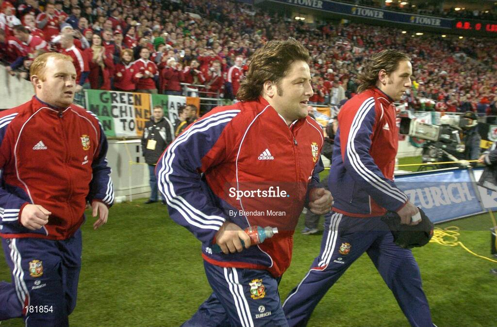 2 July 2005; British and Irish Lions players, from left, Martyn Williams, Shane Byrne and Ryan Jones make their way onto the pitch before the start of the game. British and Irish Lions Tour to New Zealand 2005, 2nd Test, New Zealand v British and Irish Lions, Westpac Stadium, Wellington, New Zealand. Picture credit; Brendan Moran / SPORTSFILE