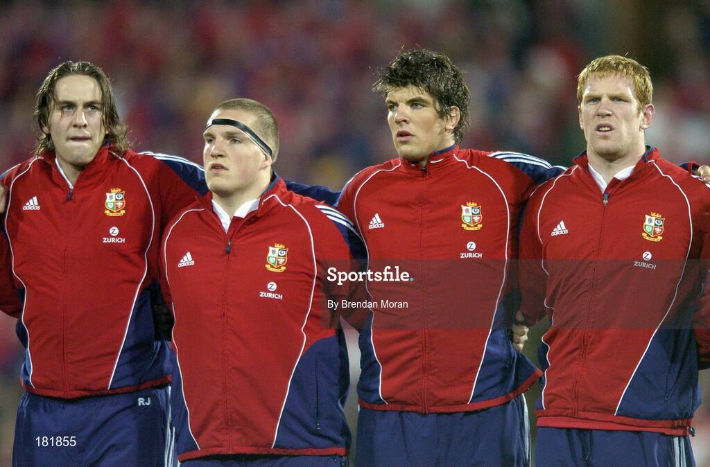 2 July 2005; British and Irish Lions players, from left, Ryan Jones, Gethin Jenkins, Donnacha O'Callaghan and Paul O'Connell line up for the national anthems before the game. British and Irish Lions Tour to New Zealand 2005, 2nd Test, New Zealand v British and Irish Lions, Westpac Stadium, Wellington, New Zealand. Picture credit; Brendan Moran / SPORTSFILE