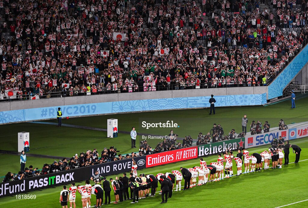 20 October 2019; The Japan team bow to supporters following the 2019 Rugby World Cup Quarter-Final match between Japan and South Africa at the Tokyo Stadium in Chofu, Japan. Photo by Ramsey Cardy/Sportsfile
