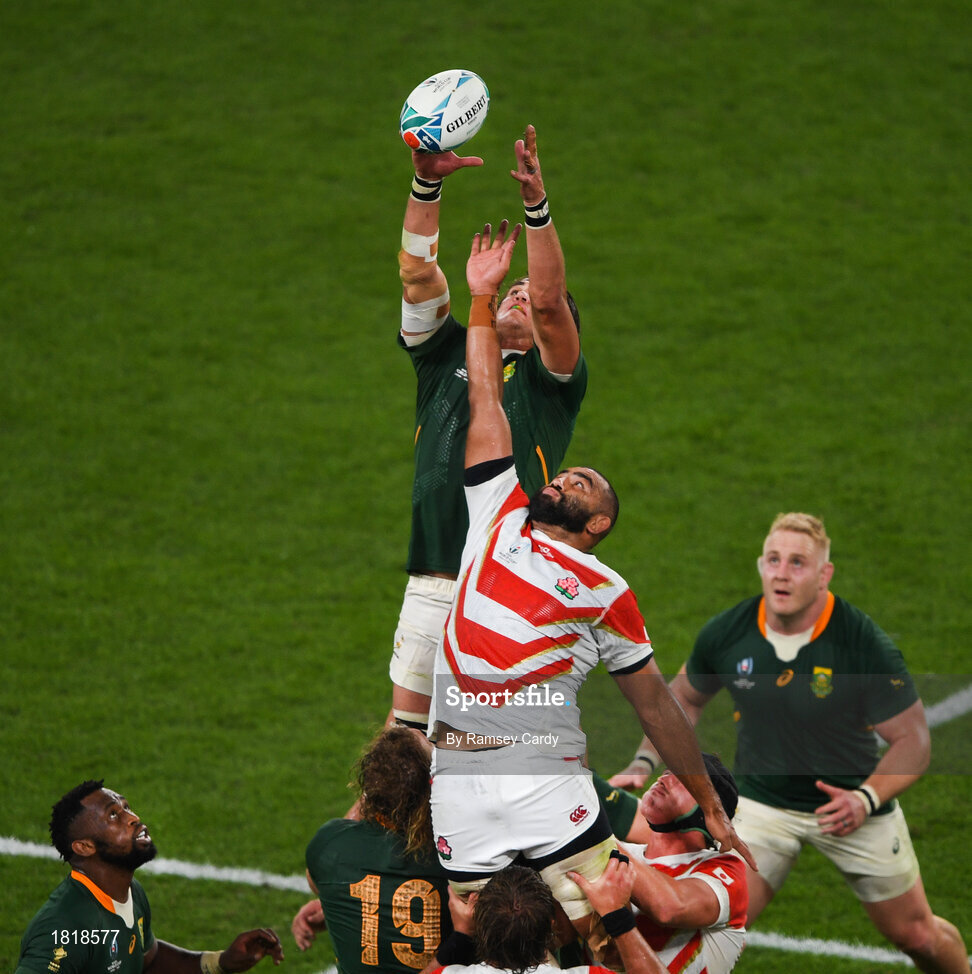 20 October 2019; Franco Mostert of South Africa wins possession in the lineout from Michael Leitch of Japan during the 2019 Rugby World Cup Quarter-Final match between Japan and South Africa at the Tokyo Stadium in Chofu, Japan. Photo by Ramsey Cardy/Sportsfile