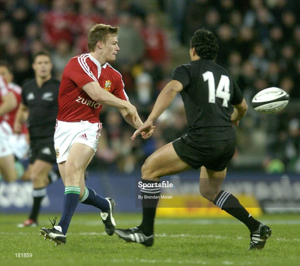 2 July 2005; Dwayne Peel, British and Irish Lions, passes the ball as Rico Gear, New Zealand, comes to challenge. British and Irish Lions Tour to New Zealand 2005, 2nd Test, New Zealand v British and Irish Lions, Westpac Stadium, Wellington, New Zealand. Picture credit; Brendan Moran / SPORTSFILE