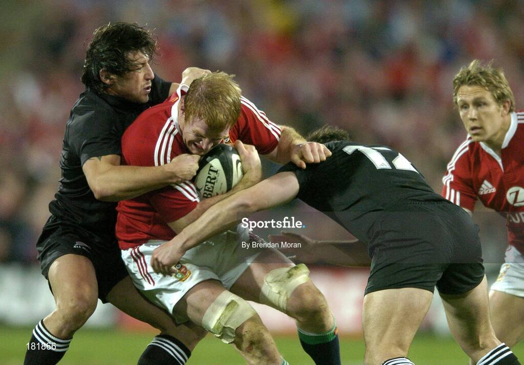 2 July 2005; Paul O'Connell, British and Irish Lions, is tackled by Byron Kelleher, left, and Aaron Mauger, New Zealand. British and Irish Lions Tour to New Zealand 2005, 2nd Test, New Zealand v British and Irish Lions, Westpac Stadium, Wellington, New Zealand. Picture credit; Brendan Moran / SPORTSFILE