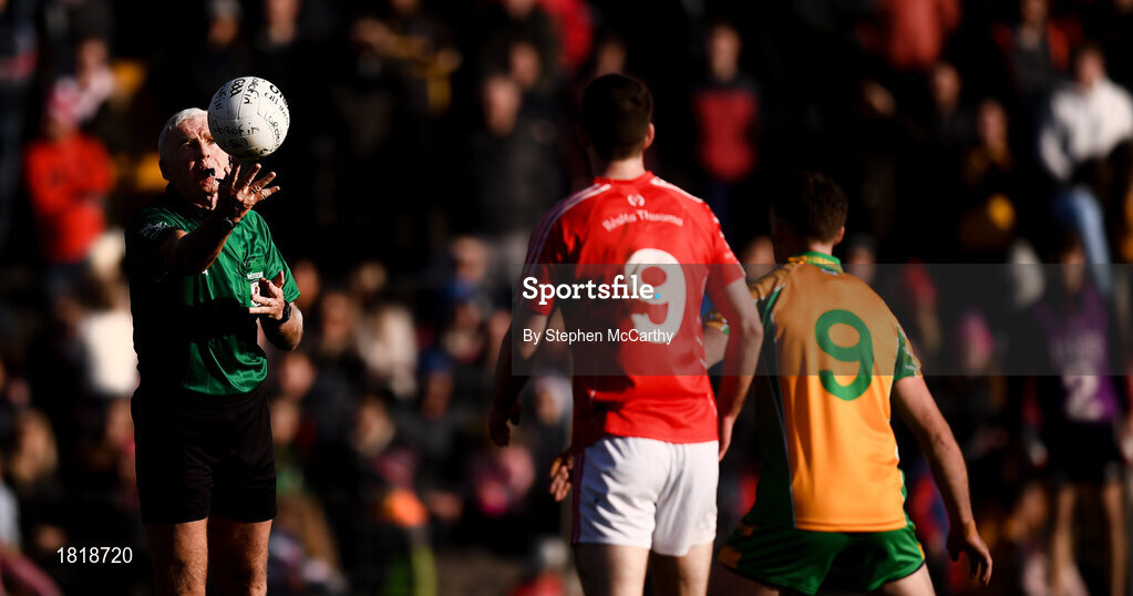 20 October 2019; Referee Gearóid Ó Conámha throws the ball in between Paul Collins of Tuam Stars and Ronan Steede of Corofin during the Galway County Senior Club Football Championship Final match between Corofin and Tuam Stars at Tuam Stadium in Galway. Photo by Stephen McCarthy/Sportsfile
