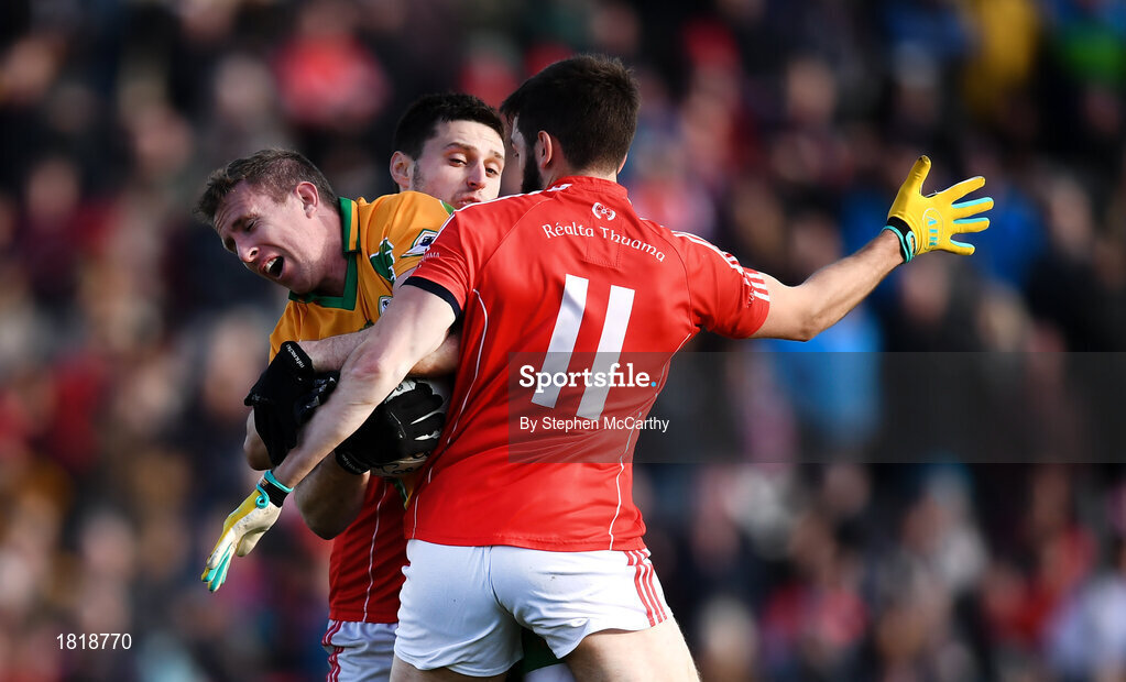 20 October 2019; Gary Sice of Corofin in action against Aonghus Tierney and Seamus Kelly, 11, of Tuam Stars during the Galway County Senior Club Football Championship Final match between Corofin and Tuam Stars at Tuam Stadium in Galway. Photo by Stephen McCarthy/Sportsfile