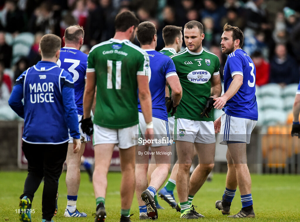 20 October 2019; Neil McGee of Gaoth Dobhair and Leo McLoone of Naomh Conaill shaking hands after the drawn match in the Donegal County Senior Club Football Championship Final match between Gaoth Dobhair and Naomh Conaill at Mac Cumhaill Park in Ballybofey, Donegal. Photo by Oliver McVeigh/Sportsfile