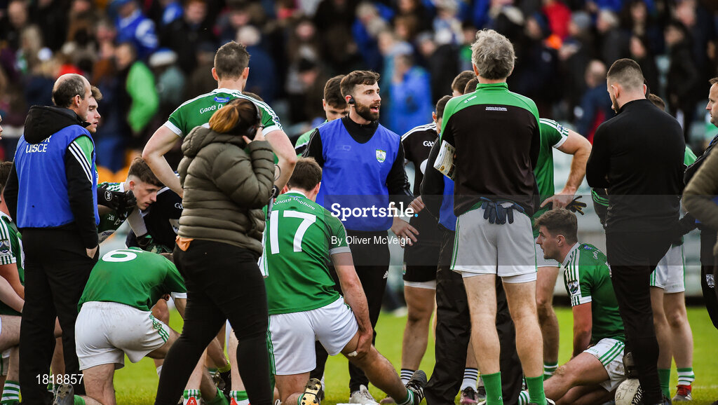 20 October 2019; Gaoth Dobhair coach Michael Boyle with his players after the drawn game in the Donegal County Senior Club Football Championship Final match between Gaoth Dobhair and Naomh Conaill at Mac Cumhaill Park in Ballybofey, Donegal. Photo by Oliver McVeigh/Sportsfile