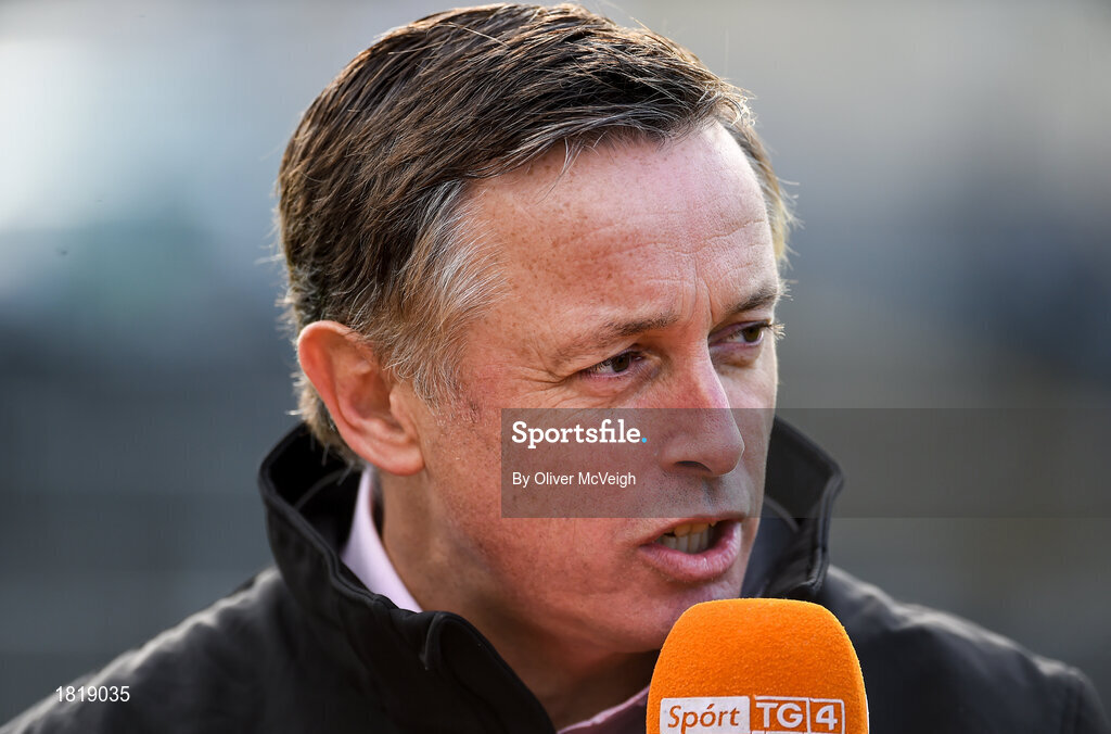 20 October 2019; TG4 presenter Micheál Ó Domhnaill during the Donegal County Senior Club Football Championship Final match between Gaoth Dobhair and Naomh Conaill at Mac Cumhaill Park in Ballybofey, Donegal. Photo by Oliver McVeigh/Sportsfile