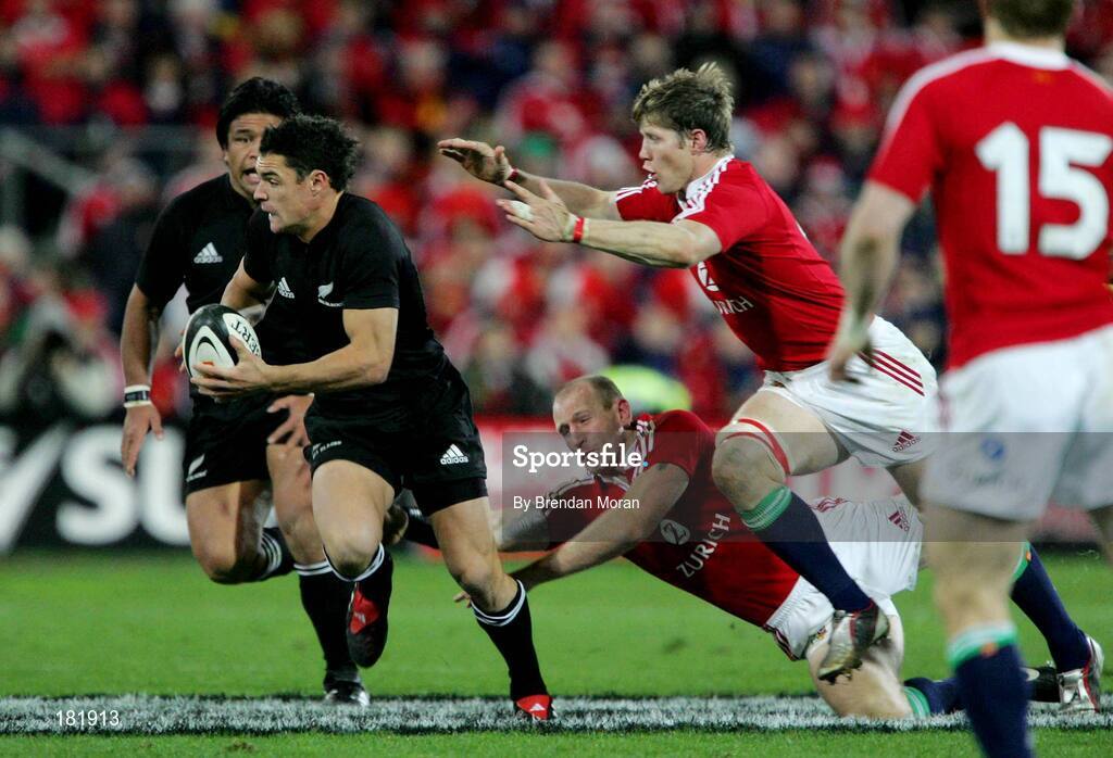 2 July 2005; Dan Carter, New Zealand, gets away from Gareth Thomas and Simon Easterby, British and Irish Lions. British and Irish Lions Tour to New Zealand 2005, 2nd Test, New Zealand v British and Irish Lions, Westpac Stadium, Wellington, New Zealand. Picture credit; Brendan Moran / SPORTSFILE