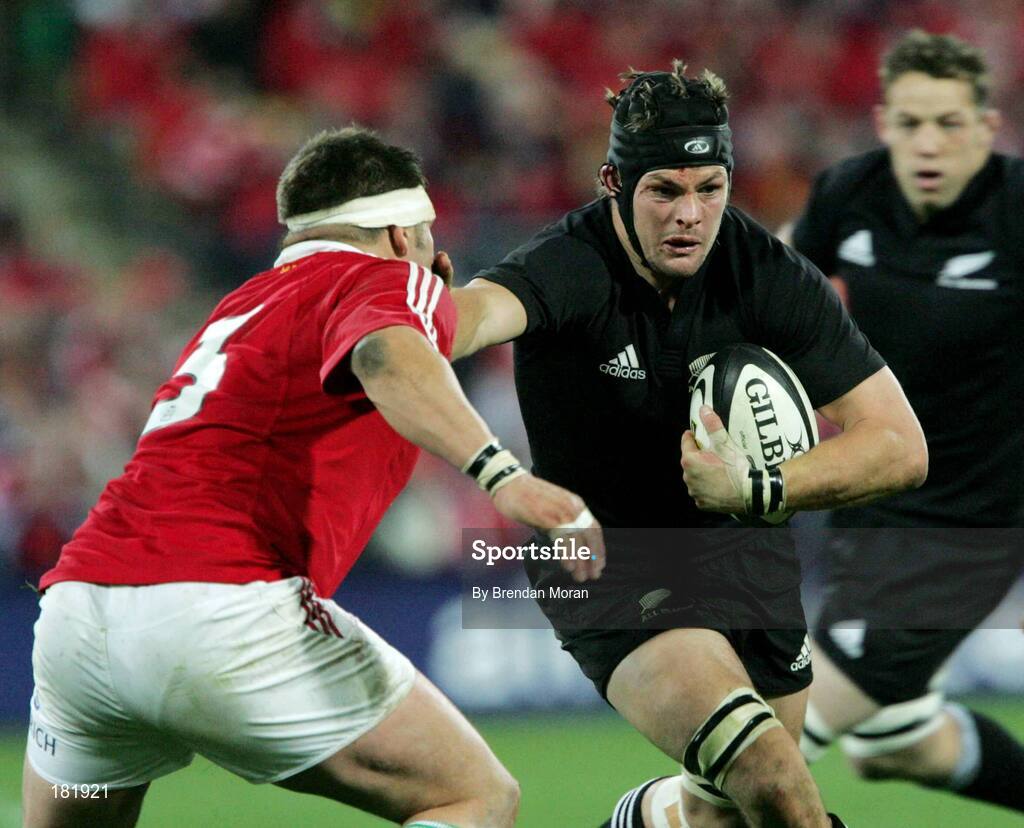 2 July 2005; Richie McCaw, New Zealand, holds off the challenge of Julian White, British and Irish Lions. British and Irish Lions Tour to New Zealand 2005, 2nd Test, New Zealand v British and Irish Lions, Westpac Stadium, Wellington, New Zealand. Picture credit; Brendan Moran / SPORTSFILE