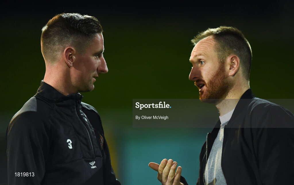 22 October 2019; Ian Bermingham of St Patricks Athletic speaking to St Patrick's Athletic Head Coach Stephen O'Donnell before the SSE Airtricity League Premier Division match between Derry City and St Patrick's Athletic at Ryan McBride Brandywell Stadium in Derry. Photo by Oliver McVeigh/Sportsfile