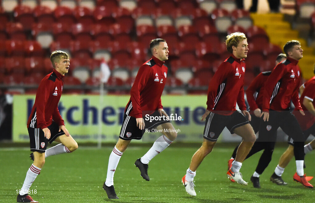 22 October 2019; Derry City players warm up before the SSE Airtricity League Premier Division match between Derry City and St Patrick's Athletic at Ryan McBride Brandywell Stadium in Derry. Photo by Oliver McVeigh/Sportsfile