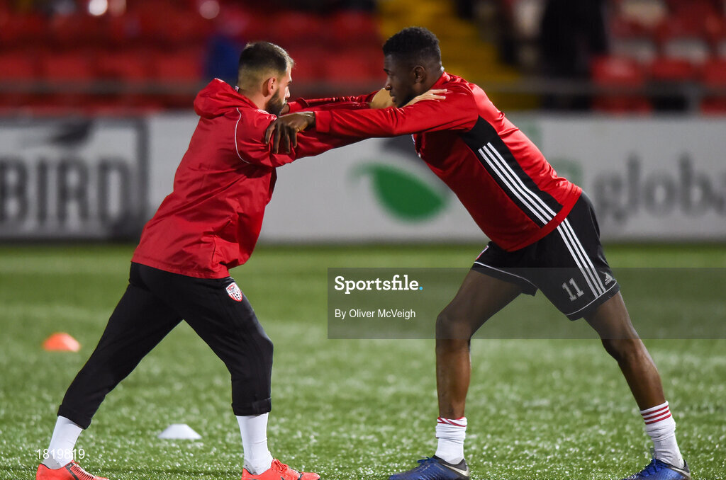 22 October 2019; Conor Davis and Junior Ogedi-Uzokwe of Derry City during warm up before the SSE Airtricity League Premier Division match between Derry City and St Patrick's Athletic at Ryan McBride Brandywell Stadium in Derry. Photo by Oliver McVeigh/Sportsfile