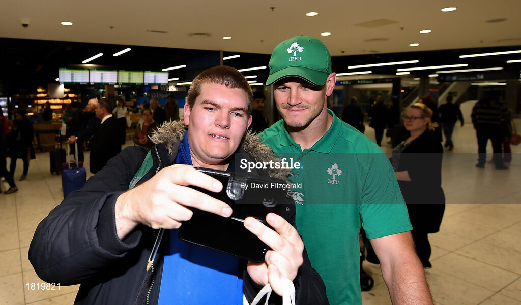 22 October 2019; Ireland supporter Stephen Cashel from Balbriggan, Co Dublin, takes a selfie with Jonathan Sexton on the Ireland Rugby Team's return at Dublin Airport from the Rugby World Cup. Photo by David Fitzgerald/Sportsfile