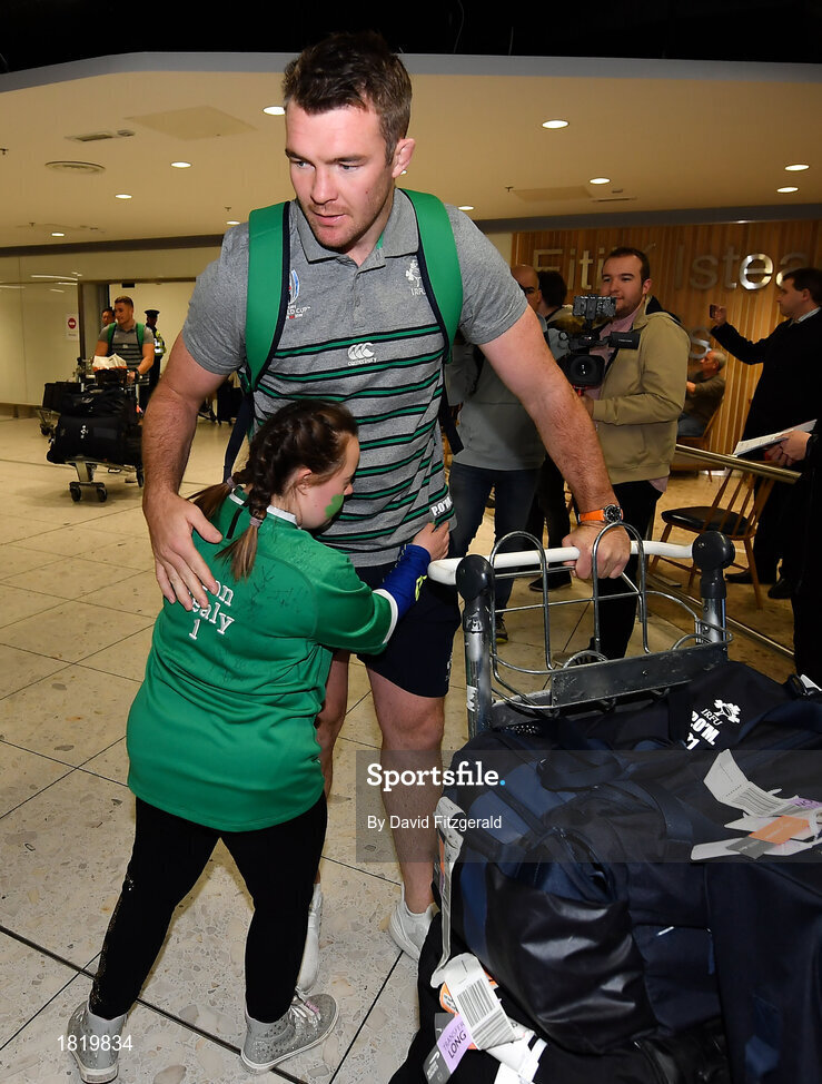 22 October 2019; Peter O'Mahony is greeted by supporter Jennifer Malone on the Ireland Rugby Team's return at Dublin Airport from the Rugby World Cup. Photo by David Fitzgerald/Sportsfile