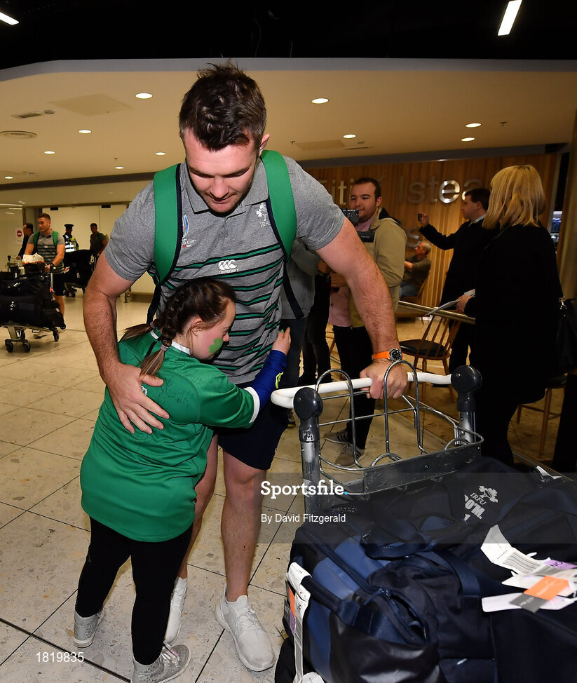 22 October 2019; Peter O'Mahony is greeted by supporter Jennifer Malone on the Ireland Rugby Team's return at Dublin Airport from the Rugby World Cup. Photo by David Fitzgerald/Sportsfile