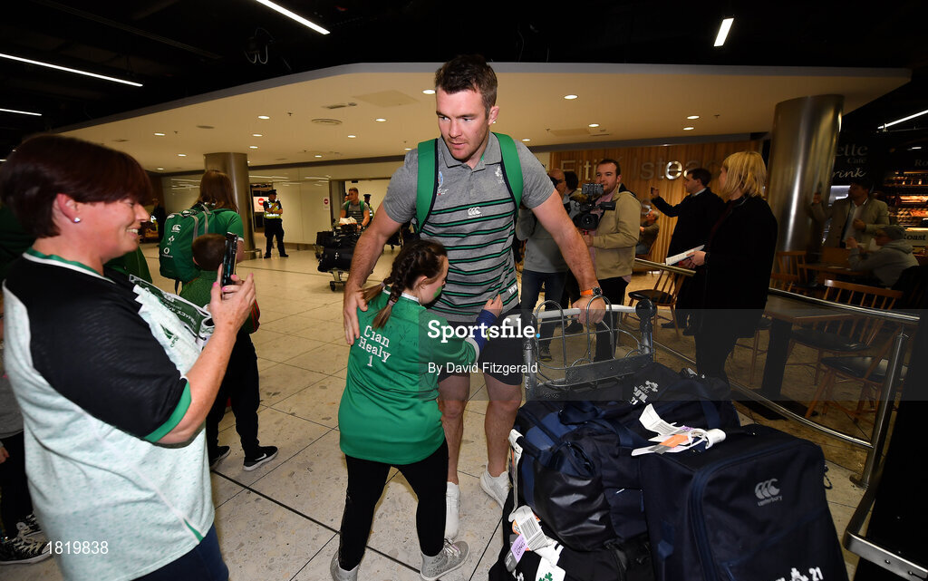 22 October 2019; Peter O'Mahony is greeted by supporter Jennifer Malone on the Ireland Rugby Team's return at Dublin Airport from the Rugby World Cup. Photo by David Fitzgerald/Sportsfile