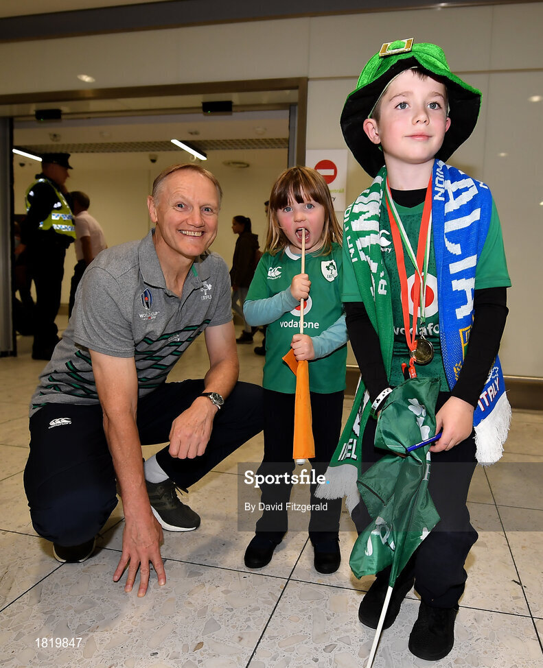 22 October 2019; Head coach Joe Schmidt is greeted by supporters Luke, age 9, and Lauren Thomas, age 4, from Newry on the Ireland Rugby Team's return at Dublin Airport from the Rugby World Cup. Photo by David Fitzgerald/Sportsfile