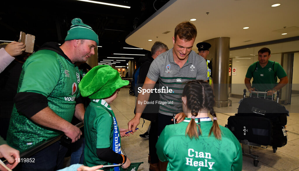 22 October 2019; Josh Van der Flier is greeted by supporters on the Ireland Rugby Team's return at Dublin Airport from the Rugby World Cup. Photo by David Fitzgerald/Sportsfile