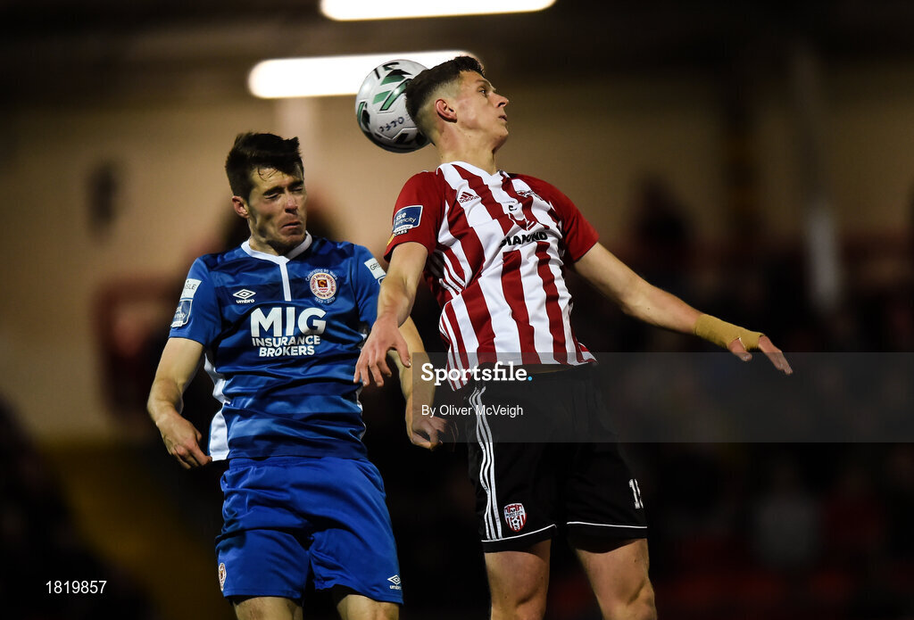 22 October 2019; Eoin Toal of Derry City in action against Lee Desmond of St Patrick's Athletic during the SSE Airtricity League Premier Division match between Derry City and St Patrick's Athletic at Ryan McBride Brandywell Stadium in Derry. Photo by Oliver McVeigh/Sportsfile