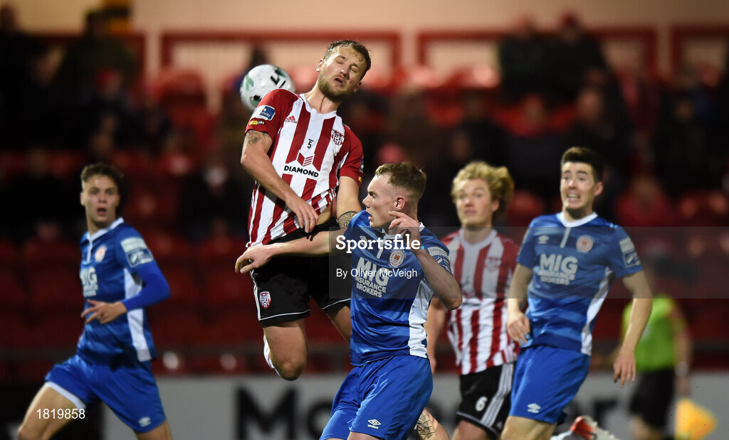 22 October 2019; Ally Gilchrist of Derry City in action against Ciaran Kelly of St Patrick's Athletic during the SSE Airtricity League Premier Division match between Derry City and St Patrick's Athletic at Ryan McBride Brandywell Stadium in Derry. Photo by Oliver McVeigh/Sportsfile