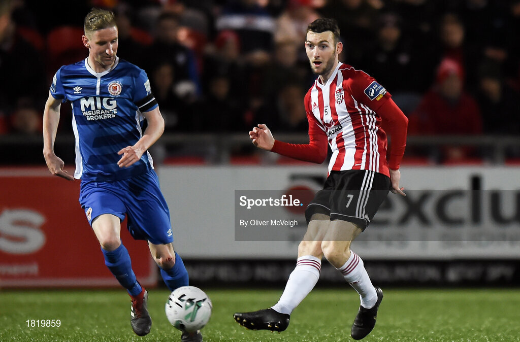 22 October 2019; Jamie McDonagh of Derry City in action against Ian Bermingham of St Patrick's Athletic during the SSE Airtricity League Premier Division match between Derry City and St Patrick's Athletic at Ryan McBride Brandywell Stadium in Derry. Photo by Oliver McVeigh/Sportsfile