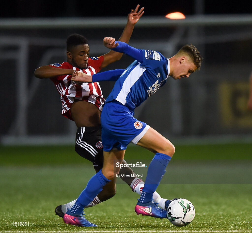 22 October 2019; Cian Coleman of St Patrick's Athletic in action against Junior Ogedi-Uzokwe of Derry City during the SSE Airtricity League Premier Division match between Derry City and St Patrick's Athletic at Ryan McBride Brandywell Stadium in Derry. Photo by Oliver McVeigh/Sportsfile