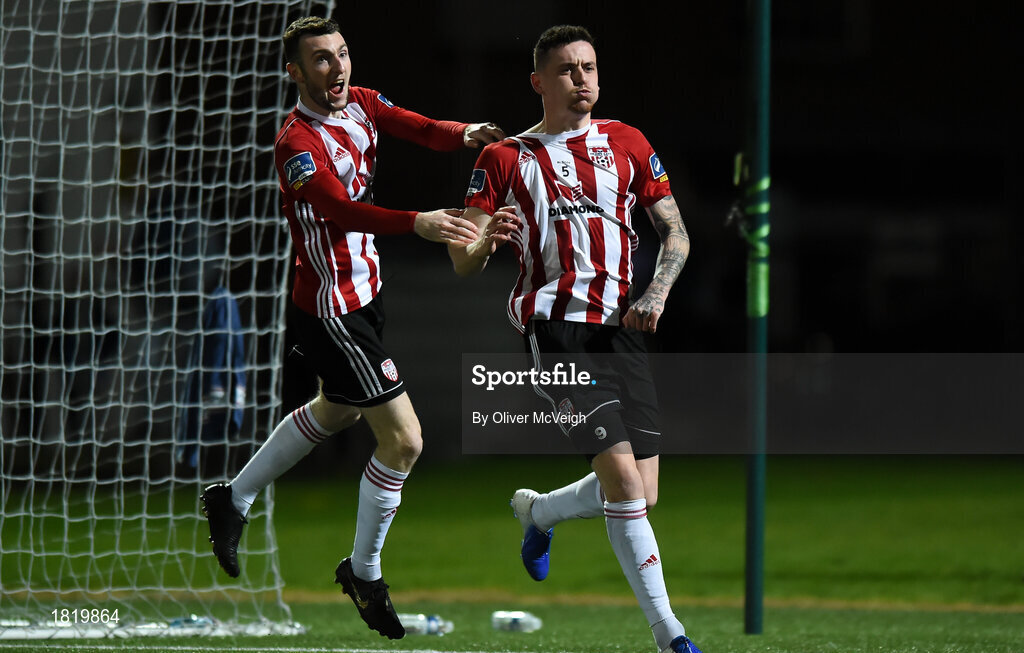 22 October 2019; David Parkhouse of Derry City, right, celebrates with team-mate Jamie McDonagh after scoring his side's first goal during the SSE Airtricity League Premier Division match between Derry City and St Patrick's Athletic at Ryan McBride Brandywell Stadium in Derry. Photo by Oliver McVeigh/Sportsfile