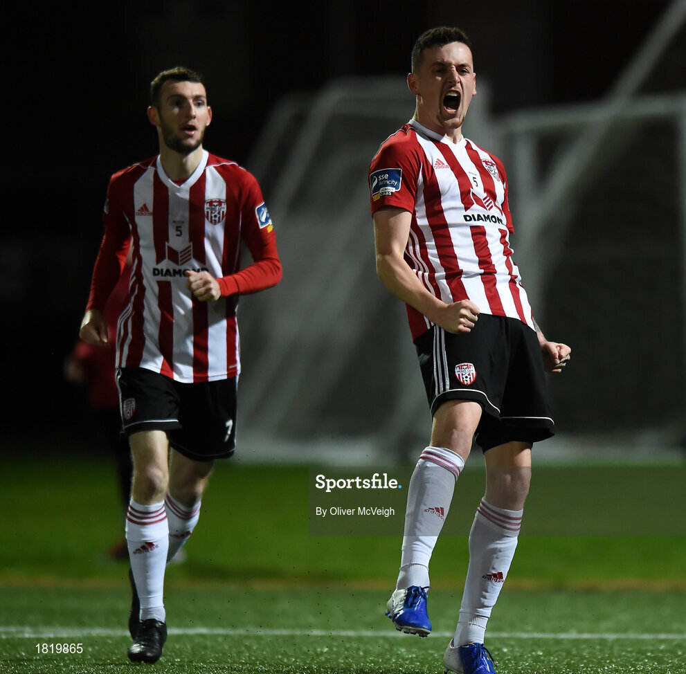 22 October 2019; David Parkhouse of Derry City, right, celebrates after scoring his side's first goal during the SSE Airtricity League Premier Division match between Derry City and St Patrick's Athletic at Ryan McBride Brandywell Stadium in Derry. Photo by Oliver McVeigh/Sportsfile