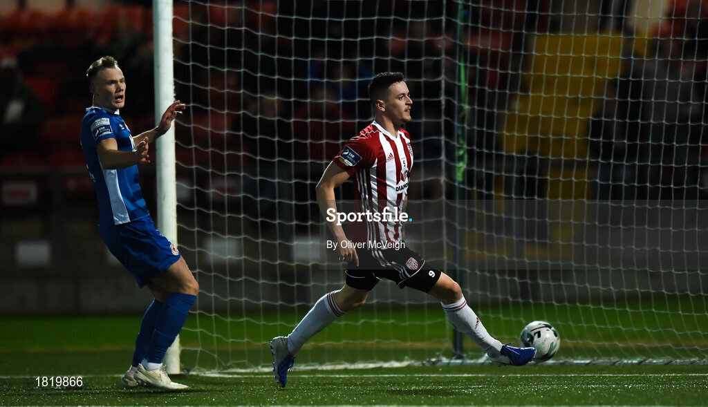 22 October 2019; David Parkhouse of Derry City scores his side's first goal during the SSE Airtricity League Premier Division match between Derry City and St Patrick's Athletic at Ryan McBride Brandywell Stadium in Derry. Photo by Oliver McVeigh/Sportsfile