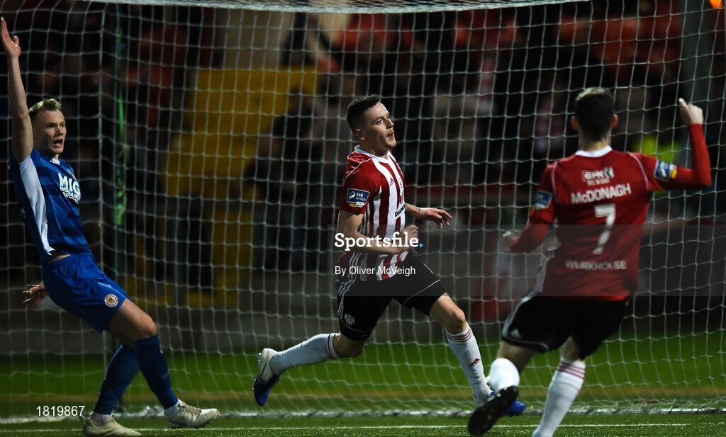 22 October 2019; David Parkhouse of Derry City celebrates after scoring his side's first goal during the SSE Airtricity League Premier Division match between Derry City and St Patrick's Athletic at Ryan McBride Brandywell Stadium in Derry. Photo by Oliver McVeigh/Sportsfile