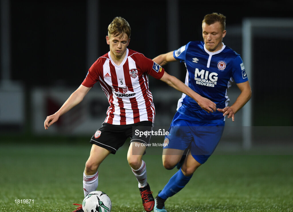 22 October 2019; Ciaron Harkin of Derry City in action against Jamie Lennon of St Patrick's Athletic during the SSE Airtricity League Premier Division match between Derry City and St Patrick's Athletic at Ryan McBride Brandywell Stadium in Derry. Photo by Oliver McVeigh/Sportsfile