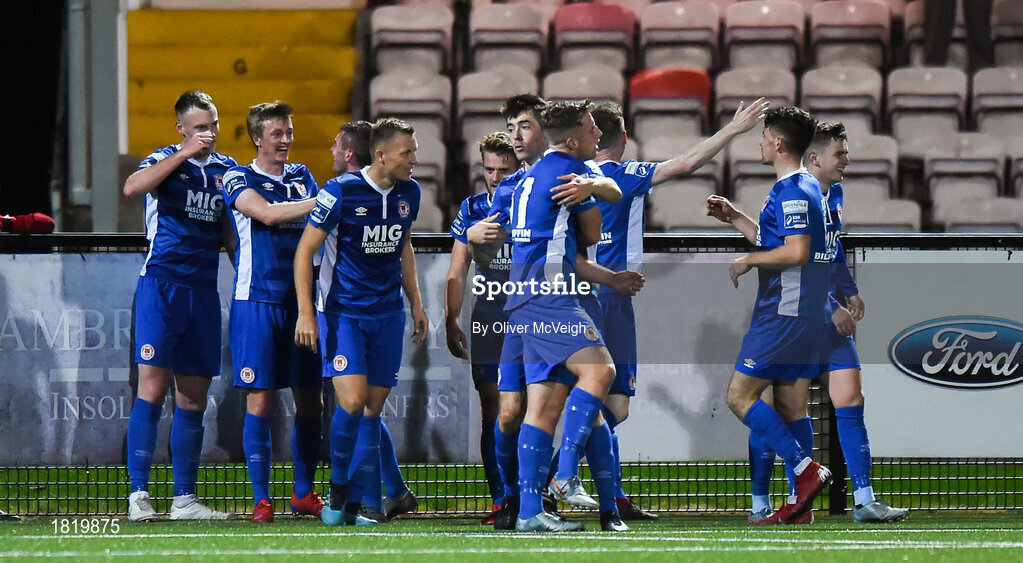 22 October 2019; St Patrick's Athletic players celebrate after their side's third goal scored by James Doona during the SSE Airtricity League Premier Division match between Derry City and St Patrick's Athletic at Ryan McBride Brandywell Stadium in Derry. Photo by Oliver McVeigh/Sportsfile