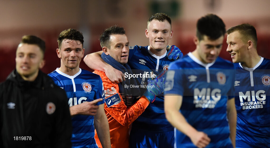 22 October 2019; Brendan Clarke and Ciaran Kelly of St Patrick's Athletic celebrate after the SSE Airtricity League Premier Division match between Derry City and St Patrick's Athletic at Ryan McBride Brandywell Stadium in Derry. Photo by Oliver McVeigh/Sportsfile